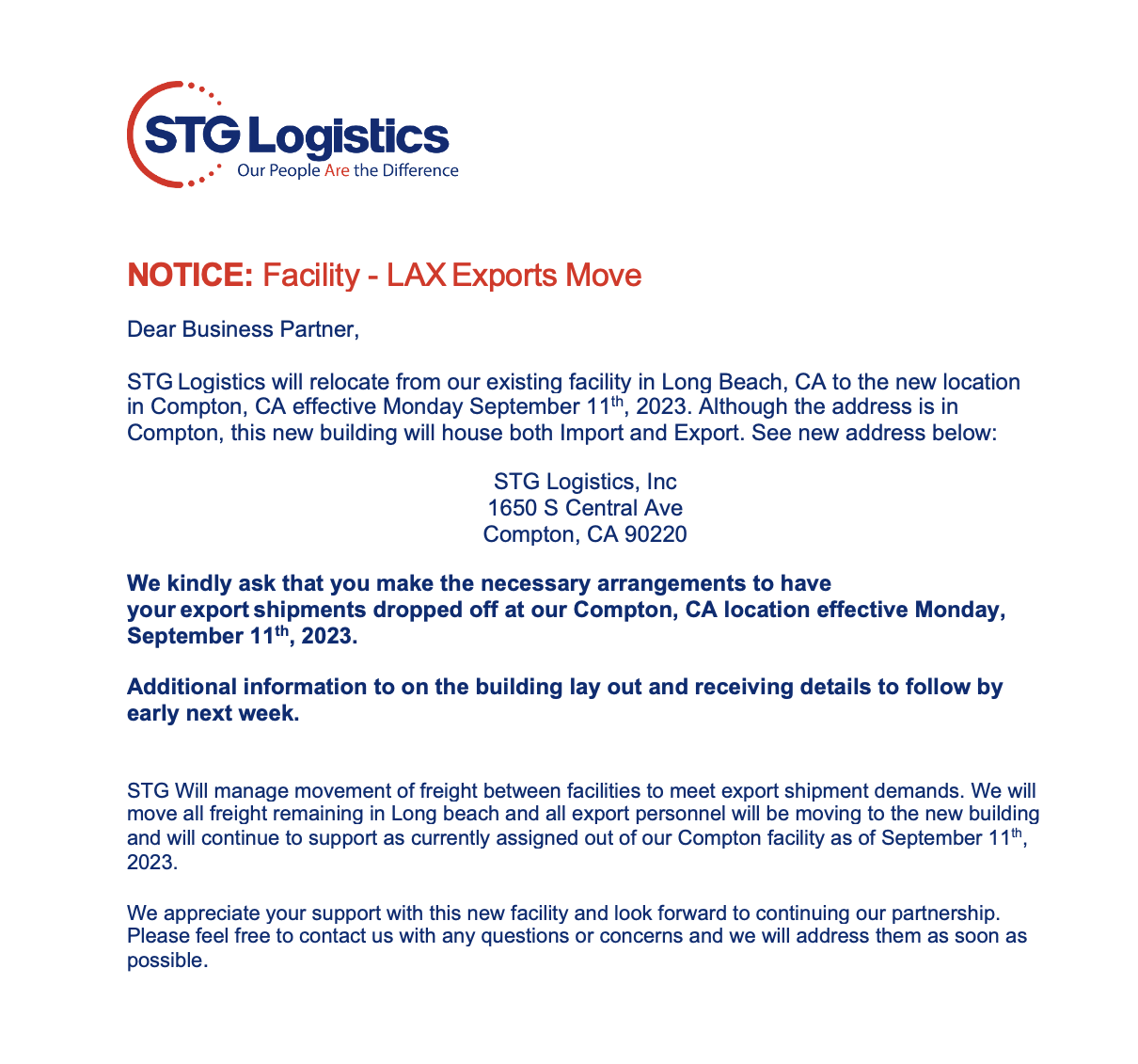 Please see announcement from our Export CFS Partner in Los Angeles